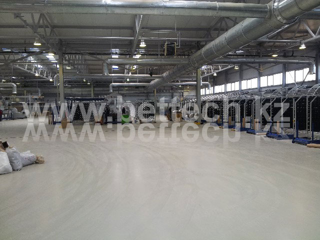 Промышленный цех, г.Атырау. Полимерное покрытие на Эпоксидной основе, средняя толщина цветного слоя 1-1,5мм, цвет серый RAL 7035, блеск глянцевый, поверхность Фактурная. Площадь - 2200м²