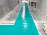 Склад готовой продукции, Туркестанская область (рудник «Южный Инкай»). Кварцнаполненное полимерное покрытие на ПУ основе, фактурное. Толщина цветного слоя 1-1,5 мм. Площадь 1500 м²