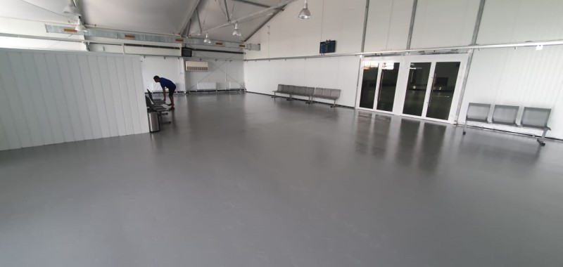 Склад, г.Актобе. Полимерное покрытие на Эпоксидной основе, цвет серый рал 7040, блеск глянцевый. Площадь - 472м²